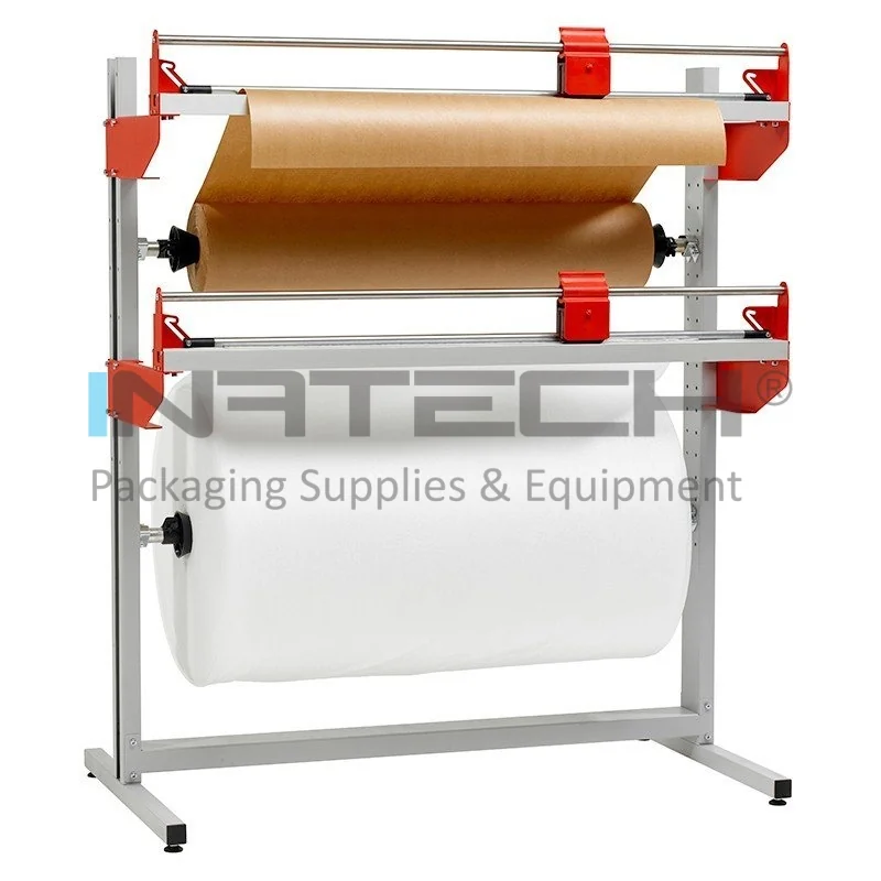 Standul de ambalare care include un dispenser fix cu suport si sistem de taiere asigura o ambalare precisa si eficienta a produselor. Diametrul maxim al rolelor atasate trebuie sa fie de maxim 900 mm, standul de ambalare oferind flexibilitate in alegerea materialelor: folie cu bule de aer, folie din polietilena expandata, folie PVC sau LDPE, rola de hartie pentru ambalare.
