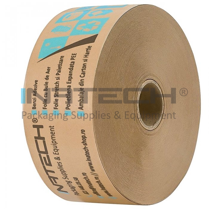 Banda Umectibila Personalizata este un produs din hartie kraft cu adeziv pe baza de amidon ce se activeaza la umezirea cu apa.