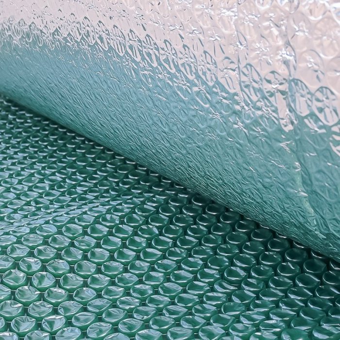 Folie Bule Mari Aluminizata obtinuta prin aplicarea unui film AL PET 24 my pe o suprafata a foliei cu bule si un film PET transparent 11 my aplicat pe partea opusa.