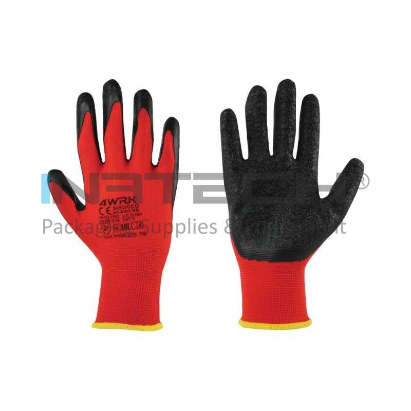 ● Compozitie: poliester cu strat de latex poros ● Greutate: 18 g/manusa ● Standarde: EN 21420, EN 388 (2,1,3,1,X) ● Ambalare: 12 perechi / cutie, 240 perechi / cutie ● Culori: tesatura tricotata rosie, acoperire neagra ● Marime: 10/XL
