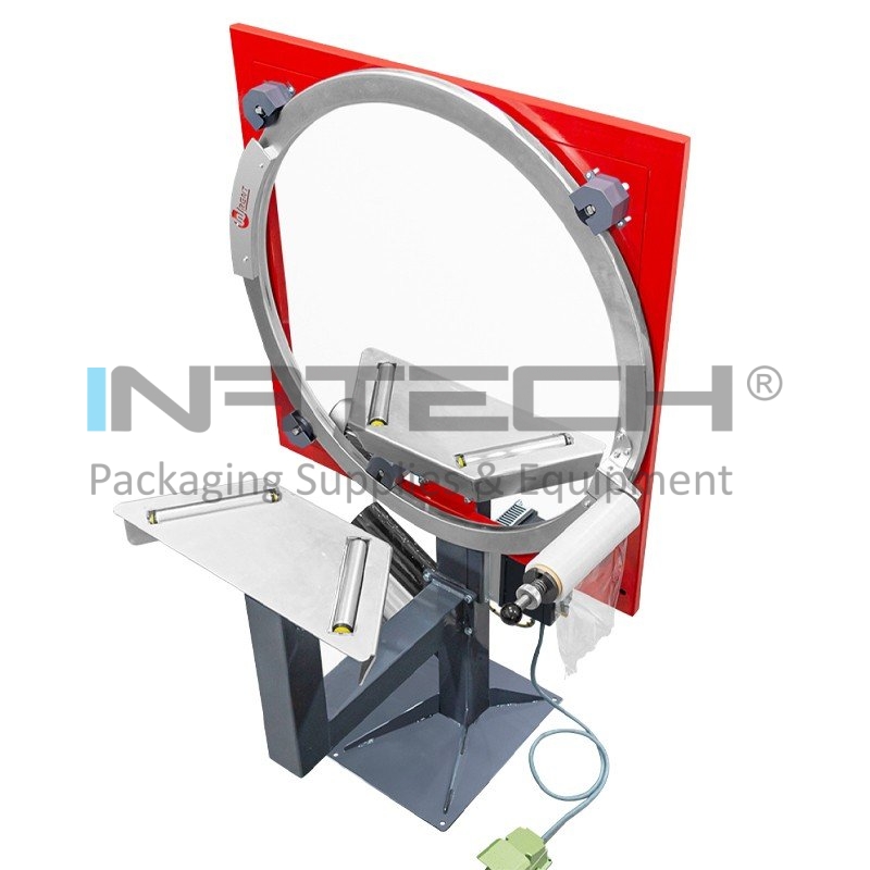 Aceasta masina de ambalare automata este destinata impachetarii coletelor cu dimensiuni circulare (anvelope, tuburi, cablaje etc) datorita rolelor incorporate in masa de lucru.