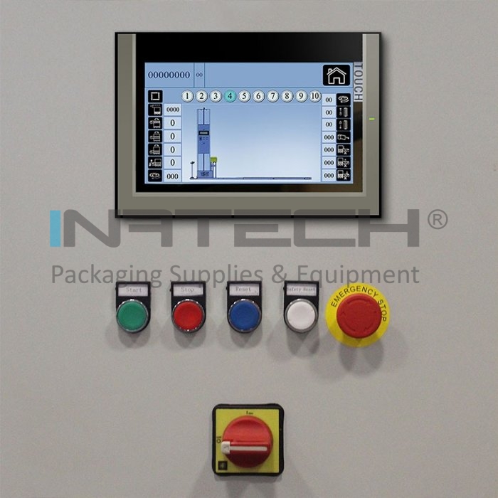 Masina este potrivita pentru productii medii si mari. Ecranul tactil al unitatii de control este echipat cu functii de detectare a erorilor si cu functii manuale. Masina de infoliat este echipata cu un sistem de prindere, taiere si sigilare a foliei si alte accesorii optionale.