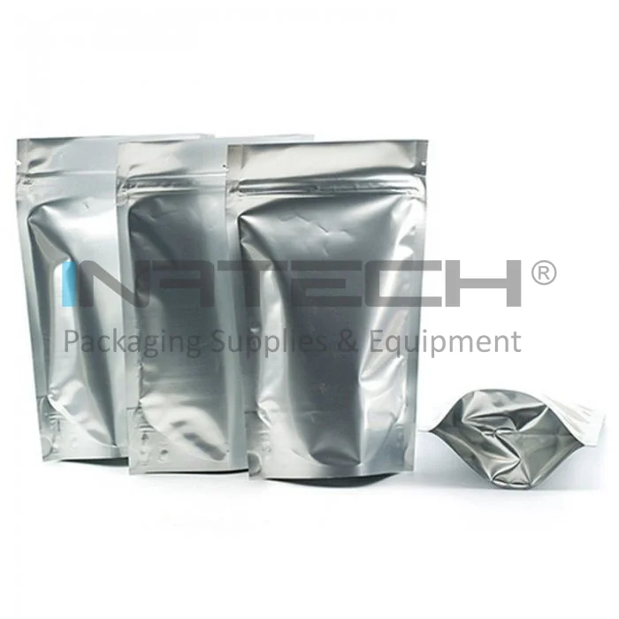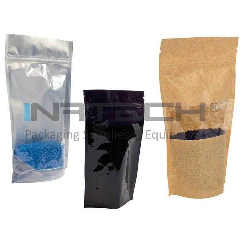 Pungi Stand Up Cu Inchidere Fermoar, 500 buc/pachet Tip Punga Hartie / AL / PE, Lungime 160 mm, Latime 110 mm, Clapeta Sigilare 25 mm, Burduf Inferior 2 x 32 mm, Volum 250 ml, Buc / Pachet 500