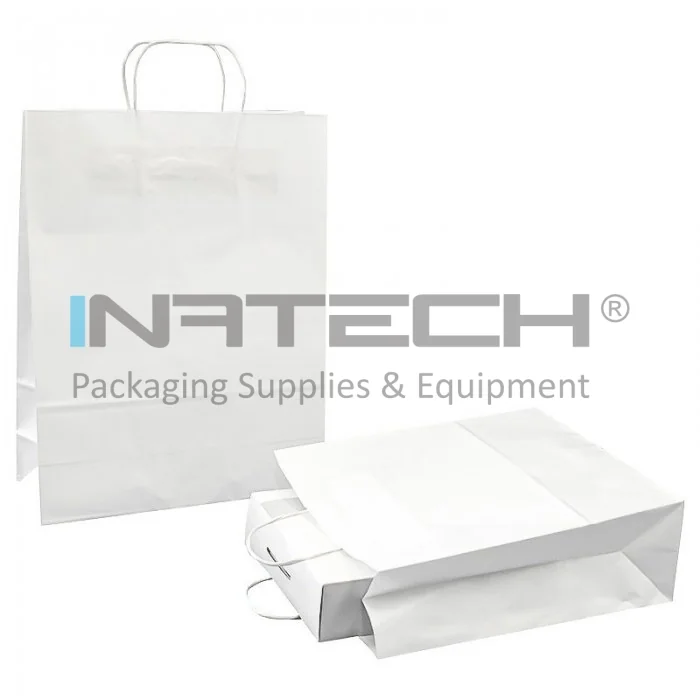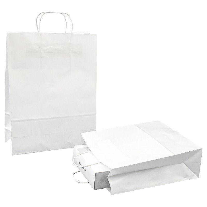 Pungi Hartie Cu Maner Rasucit, Alb/Natur Tip Maner Sfoara, Dimensiuni 430 x 160 x 470 mm, Material Hartie 100 gr/m2, Culoare Alb, Buc / Pachet 100